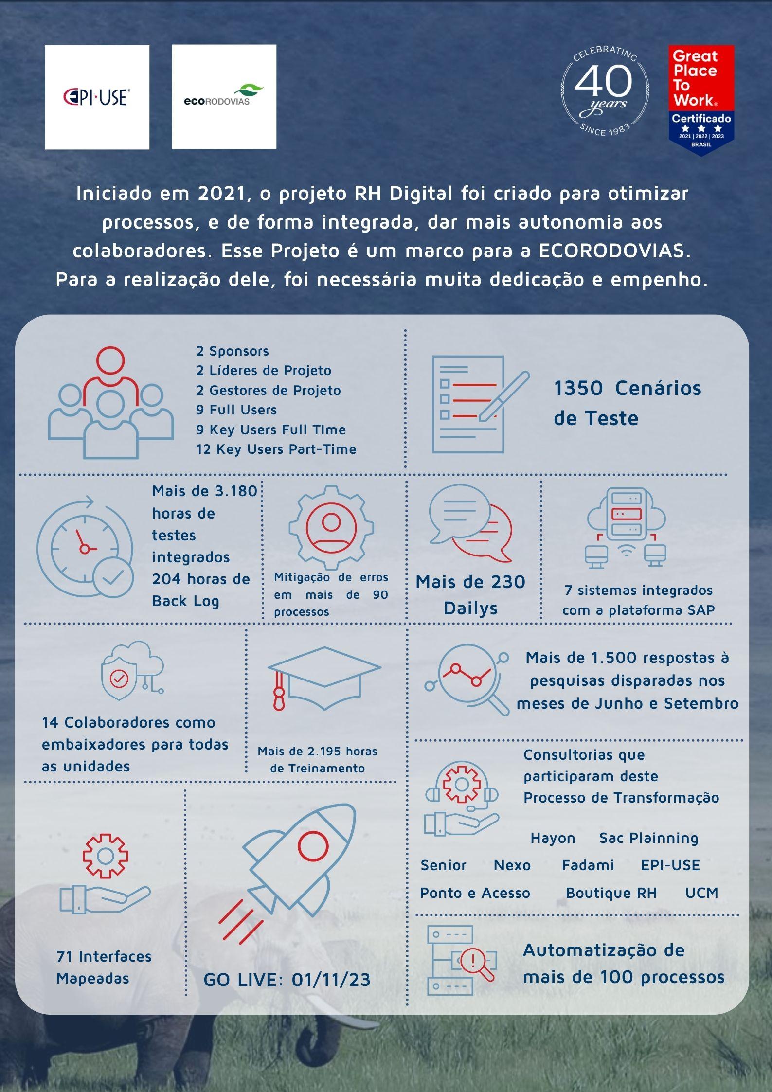 São Paulo, 6 de novembro de 2023. No dia 1 de novembro de 2023, a EPI-USE Brasil realizou o Go Live do projeto "RH Digital" da EcoRodovias. O projeto tem como objetivo otimizar processos, e de forma integrada, dar mais autonomia aos colaboradores e foi iniciado em 2021. Esse projeto é um marco para a EPI-USE Brasil e ECORODOVIAS.